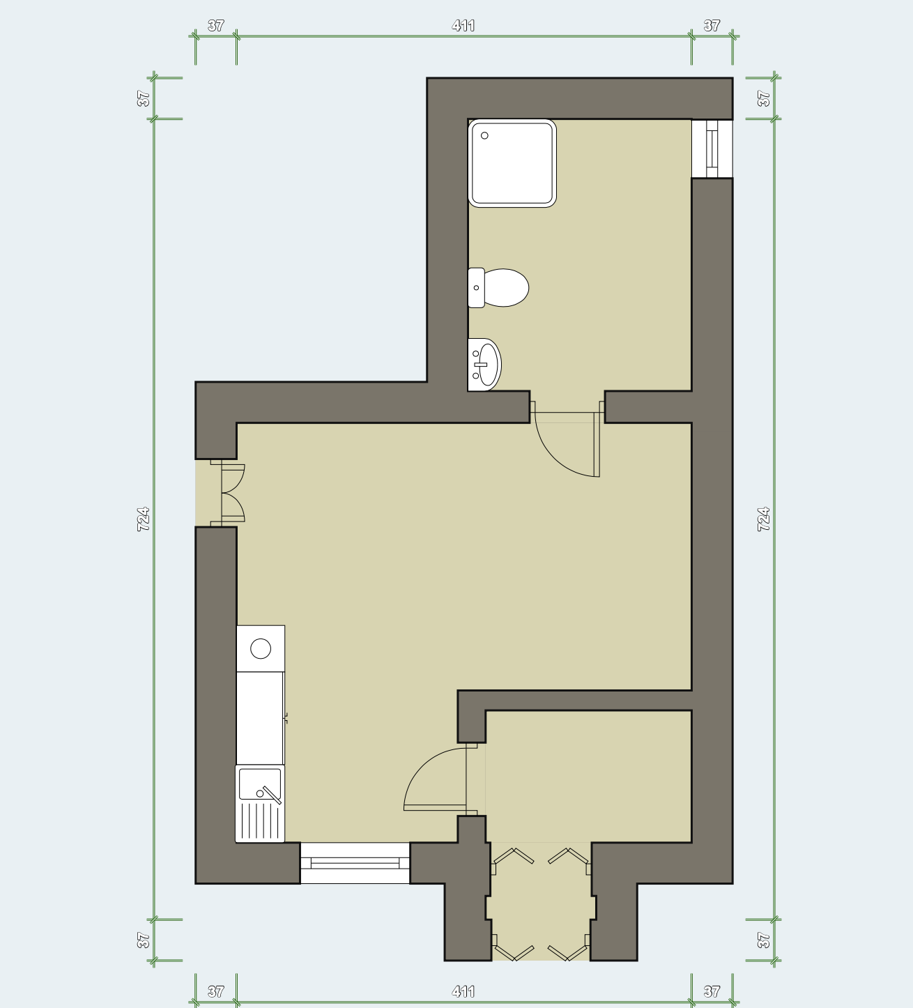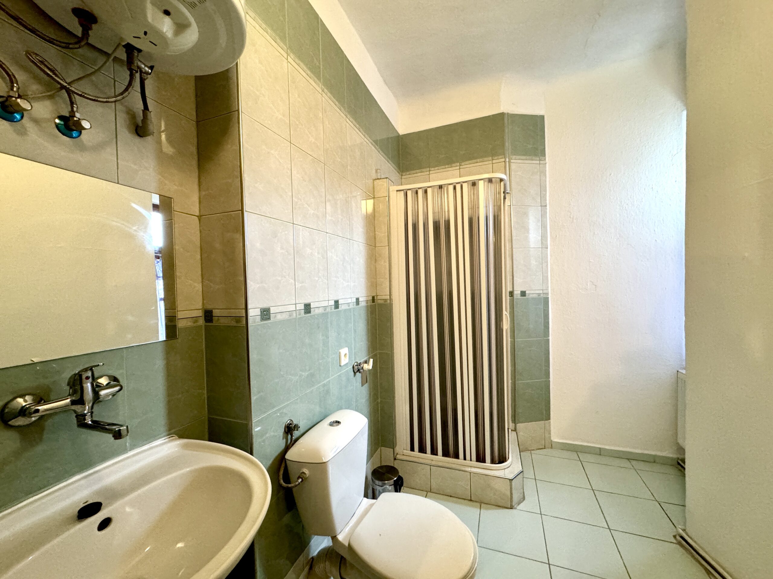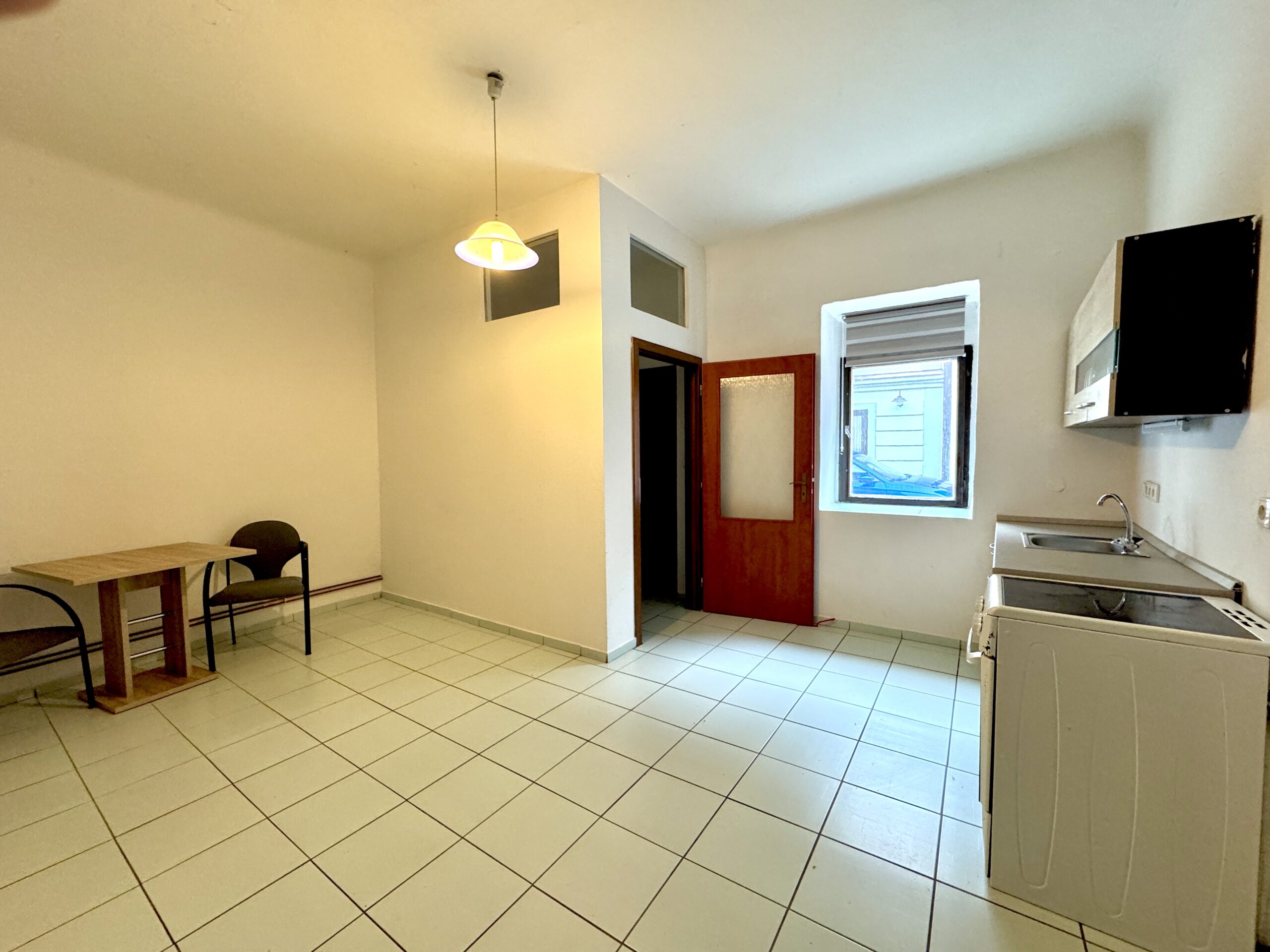 Prostor je vybaven kuchyňskou linkou. Součástí je koupelna se sprchovým koutem a WC. Okno směřuje do ulice a vytápění je centrální.