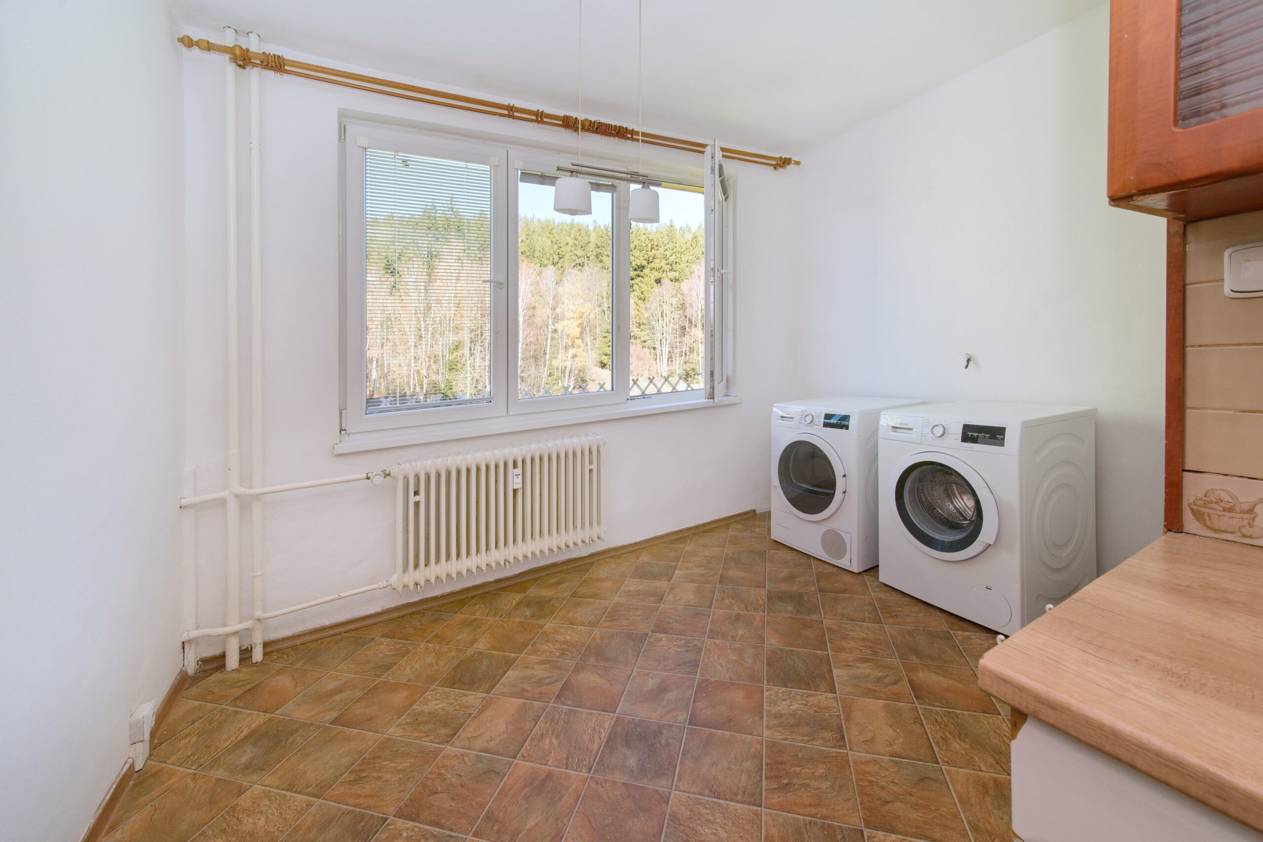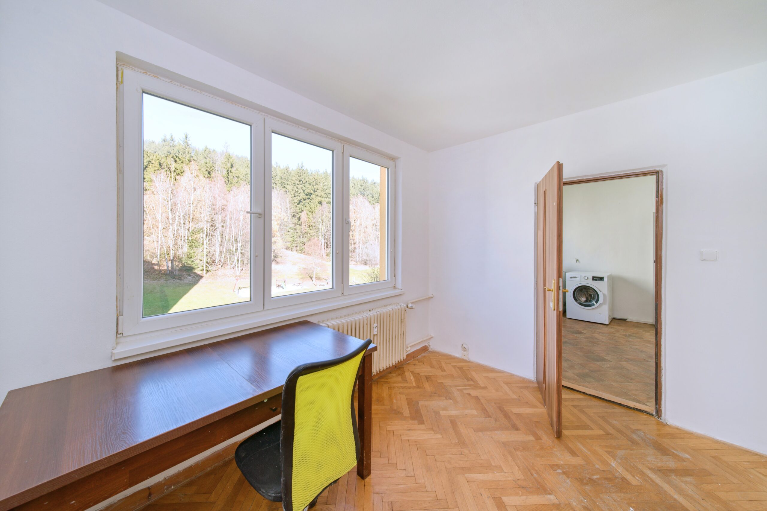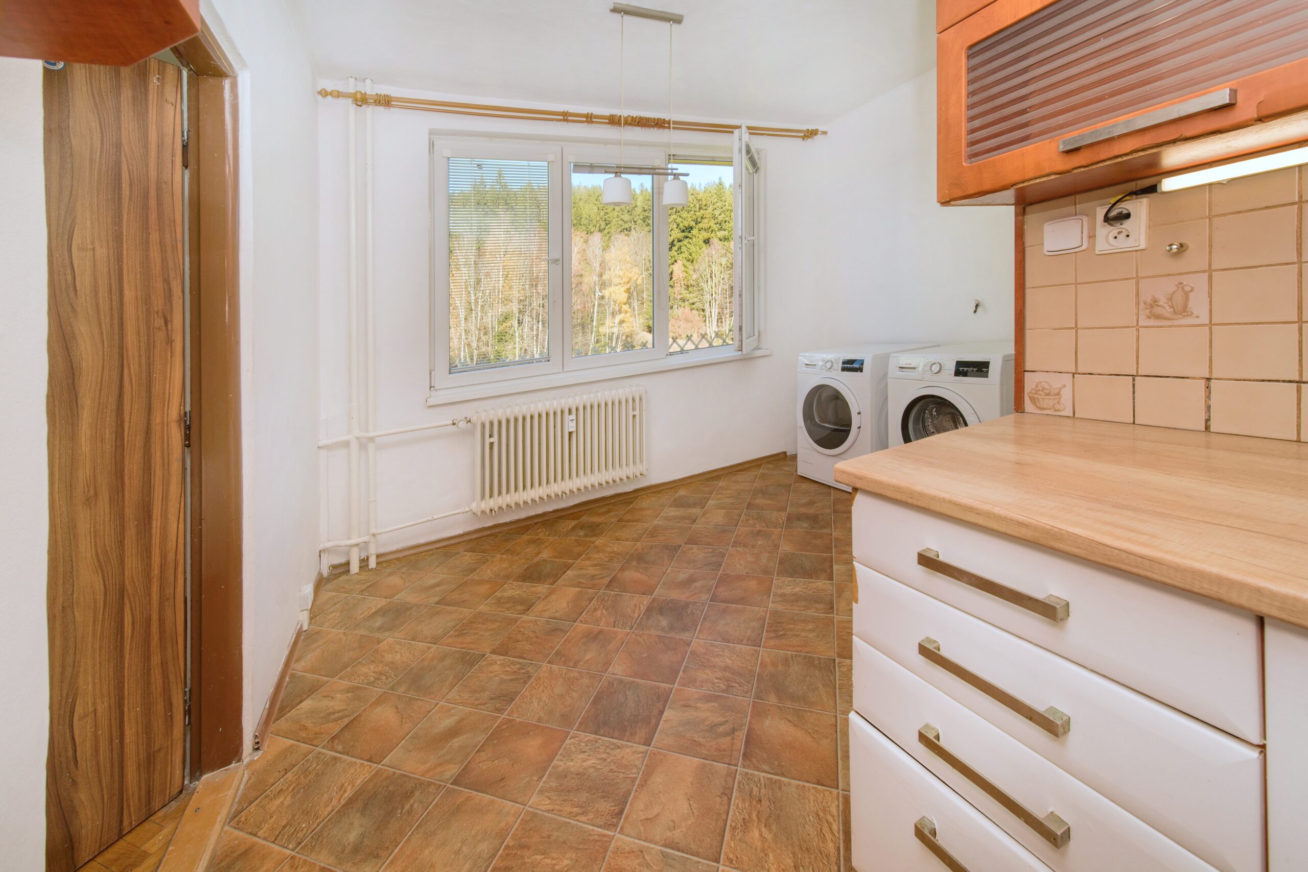Byt je řešen prakticky – chodba, kuchyň, obývací pokoj, dva samostatné pokoje, koupelna a samostatné WC. Díky odděleným místnostem působí prostorně a je vhodný jak pro rodinu, tak pro jednotlivce, kteří hledají klidné bydlení v příjemném prostředí Šumavy.
