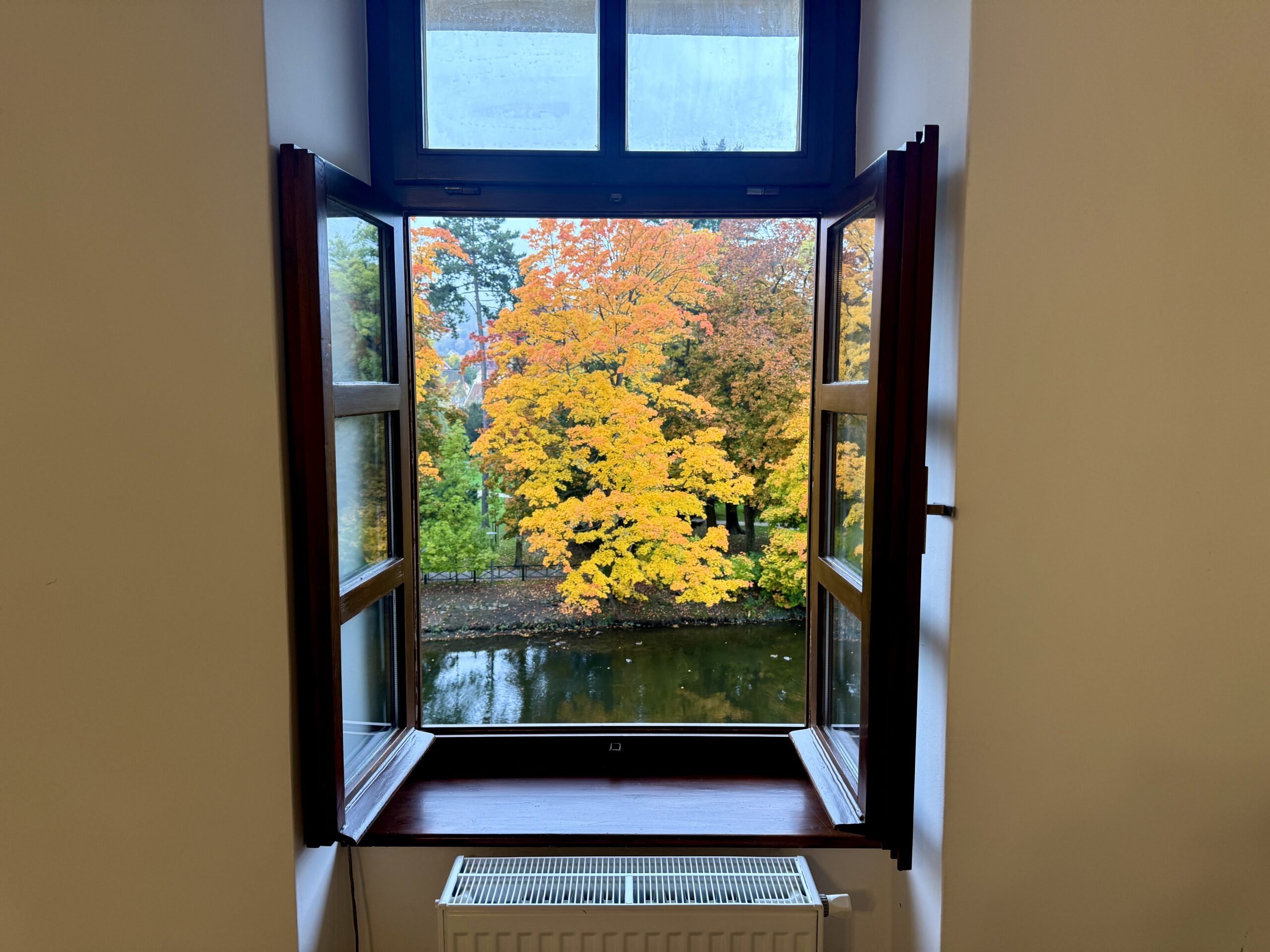 Z bytu je výhled na řeku a městský park, který dodává celému prostoru příjemnou atmosféru. Vytápění je centrální.