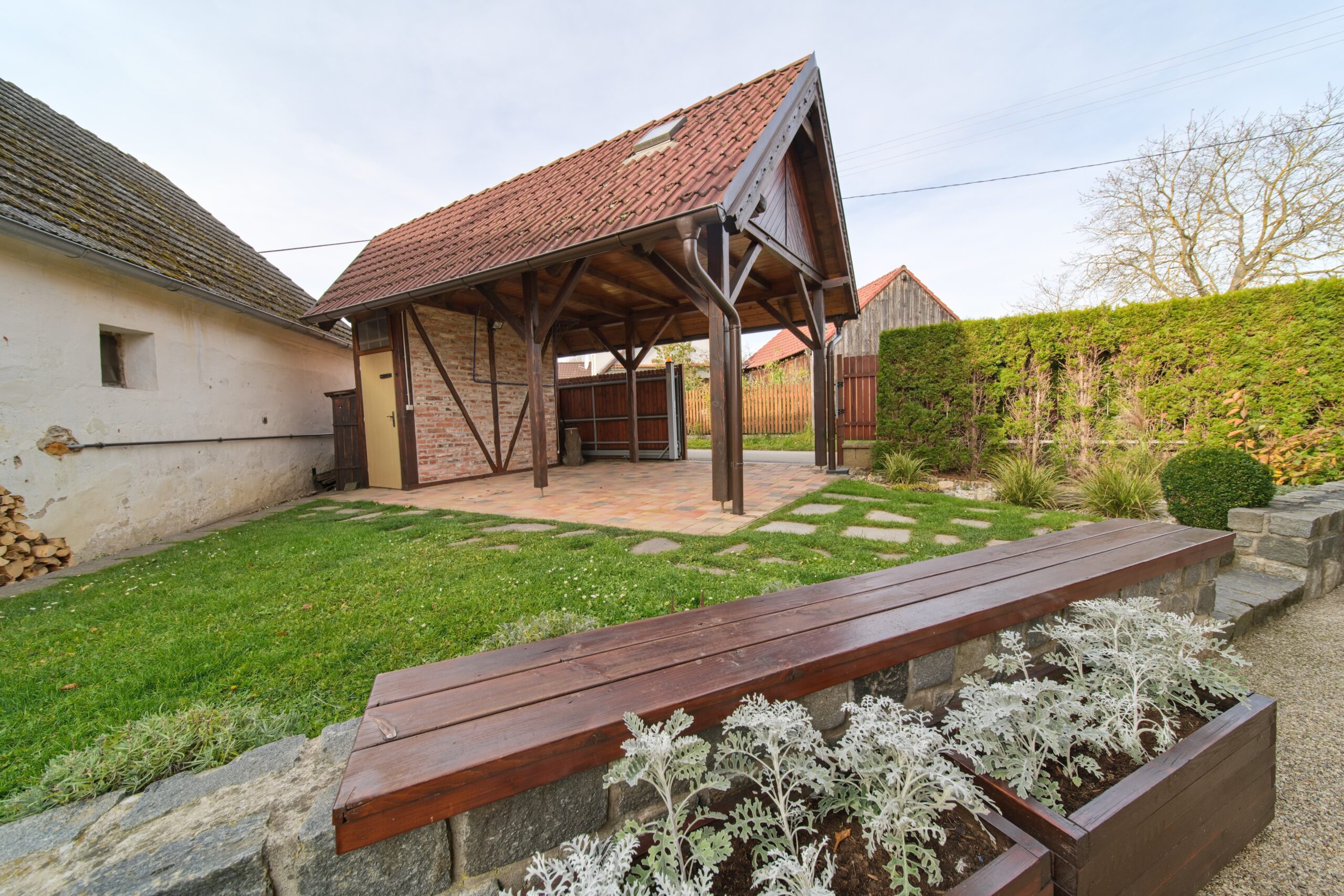 Dům disponuje kuchyní, obývacím pokojem s průchodem na terasu, dvěma ložnicemi, dvěma koupelnami a pracovním koutem. K domu náleží menší zahrada, pergola a kůlna. Parkování je možné přímo u domu.
